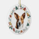 Aqui está um adorável ornamento personalizado para qualquer um que ama um pequeno cão Basenji. A frente tem uma bela imagem de aquarela de um galho Basenji castanho e branco. O retrato do cão é enquadrado dentro de uma coroa circular colorida composta por várias imagens de Férias, incluindo um boneco de neve, sinos, cana doce, estocagem, Holly e muito mais! O verso do ornamento tem a mesma imagem de coroa com uma saudação de Natal e Ano Novo. Certifique-se de atualizar o campo de texto personalizado para o nome e o ano apropriados. E veja mais imagens e produtos para cães na Dog Village.