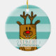 Cute Deer Baby é o primeiro ornamento cerâmico de Natal. Veado bonito sobre fundo azul com listras. Personalize o ornamento com o nome do seu bebê e o ano de nascimento e faça o seu próprio manto de Natal.