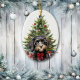 On the front of this Holiday ornament is the image of a cute black and tan Cavapoo Dog wearing a festive red bow. Behind the dog is a decorated Holiday tree. On the back, red and green text says MERRY CHRISTMAS", and there are additional text fields for you to customize. Make it say whatever you'd like!
