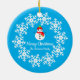 Imagem de um boneco de neve em um floco de neve e fundo azul.