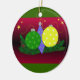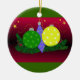 Um bonito design com Enfeites de natal coloridos em uma cama de pinheiros. Um fundo vermelho e verde o acentua.