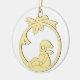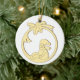 Décoration de Noël en céramique , lutin assis dans une boule décorée de rubans et de feuilles de houx , fond blanc ou pouvant être coloré.