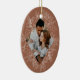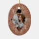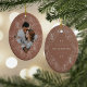 Um ornamento de feriado moderno e elegante que enquadra sua foto vertical ou orientada a retratos em um quadro em forma de diamante lindamente detalhado com folhas ocas, bagas e folhas de inverno em um fundo de terra rica e tonto. Personalize a parte de trás deste único ornamento de fotos de Natal oval com seu nome de família e o ano.