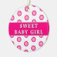 Foto de menina doce contra fundo azul. Padrão de bolinhas rosa. Insira o nome do bebê no verso em preto na área de quadros branco e prateado. O Nascimento é branco contra fundo cor-de-rosa. NOTA: se você inserir apenas o Nome, basta inserir o nome do meio do exemplo do espaço invertido a partir do modelo de texto. Design original de TamiraZDescartazes.