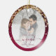 Comemore o seu noivado com este belo ornamento de fotos de keepape moderno. O texto burgundy lê "Nosso primeiro Natal engajado", com a palavra "engajado" em um roteiro elegante de folha falsa com florescimento antes e depois. A borda apresenta um design de folha de folhas dobráveis borrifadas, aspergido com brilho brilhante de ouro. Substitua a imagem de exemplo por sua foto favorita e adicione seus nomes e o ano. Um filtro de gradiente branco ajuda a fazer o pop de texto.