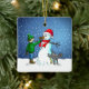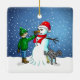O menino construiu um boneco de neve que seu cachorro se sustenta e urina enquanto o menino dá ao boneco de neve um nariz de cenoura.