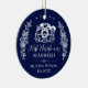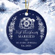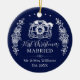 Celebrate your first holiday season as newlyweds with this elegant navy blue ceramic ornament with white text, featuring a classic just-married car illustration and floral accents. Personalize it with your "Mr. & Mrs." last name and established year to create a timeless keepsake for your tree. Makes a beautiful gift for couples celebrating their first Christmas together.