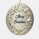 Este na moda e muito elegante ornamento da árvore de Natal (ou para onde quer que você queira pendurá-lo), apresenta um tema muito glamouroso de ouro pálido e pepino. A coroa ao redor da borda do ornamento apresenta folhas e bagas ocas em um metal dourado muito pálido, com fundo pewter/prata. As palavras tradicionais de Feliz Natal podem ser personalizadas se desejarem (por exemplo, você pode mudá-las para o nome de uma pessoa). O outro lado do ornamento apresenta o mesmo design que pode também ser personalizado.
