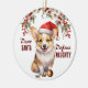 Na frente deste ornamento de Feriado está a imagem de um filhote de Corgi fofo vestindo um chapéu de Papai Noel vermelho e branco. Ele se senta com um ornamento de árvore quebrada na frente dele. O texto vermelho diz "Caros PAPAIS NOEIS Definem NASCIDOS". No verso, o texto vermelho e verde diz MERRY CHRISTMAS", e há campos de texto adicionais para você personalizar o que quiser.
