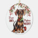 Na frente deste ornamento de Férias está a imagem de um filhote de Doberman Pinscher fofo vestindo um colar de morango sagrado e vermelho. Ele se senta com um ornamento de árvore quebrada na frente dele, e outros ao lado dele. O texto vermelho diz "Caros PAPAIS NOEIS Definem NASCIDOS". No verso, o texto vermelho e verde diz MERRY CHRISTMAS", e há campos de texto adicionais para você personalizar o que quiser.