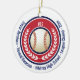 Crie um ornamento personalizado de baseball para o seu jogador favorito. Possui uma bola de beisebol com design bonito. Adicione o número da equipe de jogadores, o status do campeonato, o ano, o nome da escola ou outro texto personalizado. Design branco, vermelho e azul é perfeito para sua árvore de Natal de Natal.