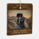 Estes ornamentos de Natal simples e minimalistas mostram sua foto favorita de casamento na frente, junto com suas iniciais, o ano, e as palavras "feliz e casado" em máquina de escrever branca parecem texto em uma madeira rústica e marrom. A parte traseira apresenta outras fotos de seu casamento, iluminadas com uma sobreposição para que você possa adicionar texto ou nomes a ela. Um na moda para guardar o seu primeiro Natal como marido e mulher.