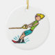 A design de esqui d'água mostra esquiador no esqui da água solteiro cortando através da água. Leva-se a corda de reboque, veste engrenagem de esqui e tons, o cabelo sopra com a velocidade do vento. Imagem divertida, brilhante e original do estilo do logotipo para esquiadores e fãs de água deste esporte.