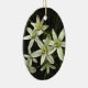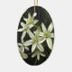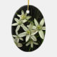 Este ornamento de férias de fotografia de arte apresenta a adorável planta de jardim perene primavera, conhecida como Estrela de Belém (Ornithogalum umbellatum). Cada flor tem seis pétalas brancas e um centro amarelo. As flores estão sobre um fundo escuro, quase preto.