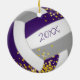 Este adorno bonito de vôlei apresenta a imagem realista de um voleibol que tem painéis roxos, cinzas e brancos e uma aspersão de minúsculas estrelas de brilho dourado, sobre as quais você pode personalizar o nome do jogador na frente e no ano comemorativo na parte de trás - por katz_d_zynes