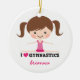 Ornamento personalizado bonito para os gymnasts que caracterizam uma menina pequena dos desenhos animados com o cabelo marrom que faz sidesplits. Abaixo dela é o texto "que eu amo a ginástica (do coração)". Adicione seu nome ou o outro texto. Design do divertimento para meninas.