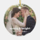 Feliz e Brilho | Ornamento de Fotos de Casal de Natal inteligente. Um ornamento de fotos de feriado inteligente de na moda, com uma letra retrô ousada, que diz "feliz e brilhante" em branco. A saudação, o nome e o ano podem ser facilmente personalizados para um toque pessoal. Uma design moderna, minimalista e contemporânea para se destacar nesta temporada de férias! A imagem mostrada é apenas para fins de ilustração para ser substituída pela sua própria foto.