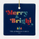 Este ornamento de árvore de Natal quadrada apresenta o texto "Feliz e Brilho" em um estilo retrorreflector vibrante. O texto destaca-se em relação a um fundo azul escuro, criando um contraste visualmente notável. Personalize este ornamento de temas retrorados com seu nome e ano. Fotografia © Storytree Studios, Stanford, CA