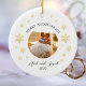Comemore o seu dia especial com a nossa Feliz e Enfeites de natal casado com a sua foto de casamento. Colocado sobre um fundo branco com flocos de neve de ouro delicados, esse ornamento é enfeitado com um roteiro manual informal e casual, perfeito para adicionar um toque personalizado. Personalize com o nome do casal e a data do casamento. Este bem pensado é um belo presente para recém-casados celebrarem juntos o seu primeiro Natal. Ideal para lembrar memórias e adicionar um toque pessoal e elegante ao seu decoro de férias!