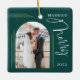 Ornamento de fotos da Feliz 2 e casada. A design apresenta um quadro de arco fotográfico com linhas verticais douradas para exibir sua foto especial de casamento, o roteiro de tipografia "Casado & Feliz" e um ano na frente. Personalize ainda mais com outra foto e seus nomes no verso. Perfeito para celebrar seu primeiro Natal como casal casado ou como presente para recém-casados. Trendy, elegante, design moderno.