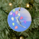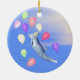 Enfiando o ornamento com minha alegre trabalho de arte 3d original de um golfinho saltando vestindo um chapéu de aniversário com balões coloridos ao seu redor.