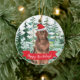 Um Enfeites de natal de Cachorro da Terra Nova, datado e bonito, em um fundo de pinheiros e pinheiros, com a mensagem de feriado "Feliz Howlidays". Visite nosso compro para ver uma grande variedade de pães de cão