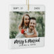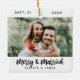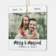 Uma simples Feliz e Enfeites de natal casado com tipografia de script e sua foto. Personalize com seu nome, data de casamento e foto. O verso do ornamento tem um simples padrão de xadrez preto e branco. Projetado para você pelo Blackberry Boulevard.