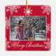 Ornamento de fotos de Natal Festivo e Feliz com uma bela moldura de flocos de neve. Personalize com o nome da família e o ano.