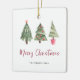 Simples decoração de Natal. Design apresenta 3 árvores de natal de aquarela, o título 'Feliz Natal' em um roteiro de caligrafia vermelho festivo e nome da família.