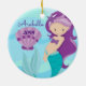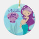 Celebre a temporada de férias com este adorável ornamento personalizado de sereia. O fundo está debaixo do mar. Ambos os lados são iguais e apresentam uma doce sereia de cabelo roxo com uma grande concha roxa. Personalize com um nome e o ano ou data de nascimento. Excelente para sua pequena diva em casa. Perfeito para pendurar numa árvore, num manto ou em qualquer outro ecrã especial.