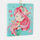 Celebre a temporada de férias com esta adorável sereia de aquarela personalizada. Fundo é uma cor azul clara. A frente apresenta um fundo azul claro com uma doce sereia vermelha de cabelos cercada por amigos de peixes, bolhas e conchas. O verso pode ser personalizado com um nome e data ou qualquer mensagem especial. Perfeito para pendurar em uma árvore, manto ou qualquer outro monitor especial. Clipart por StarJam4Kids.