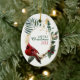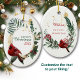 Aqui está um Enfeites de natal bonito que faz um belo presente de guardiã, especialmente para uma filha ou neta. Você poderia adaptá-lo facilmente para uma avó ou qualquer outra pessoa, também. A frente apresenta uma coroa oval com imagens de folhas verdes, bagas ocas, vagens de sementes e um cardeal vermelho brilhante. Um fino quadro de ouro separa a coroa oval do texto no meio que diz "Feliz Natal" com o ano que você pode facilmente personalizar. As cinzas de ouro com brilho aumentam o brilho e o interesse. A parte de trás do ornamento tem mais três campos de texto personalizados e uma metade cardinal correspondente. Elegante, e personalizado só para ela!