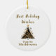 Este ornamento de Feriado bonito apresenta uma bolbo decorativa de árvore preta e dourada pendurada de uma bonito coroa sazonal. O texto curvo de ouro escuro diz "MERRY CHRISTMAS". A parte de trás do ornamento tem seu próprio texto personalizado em três campos de texto separados por uma árvore de feriado preto-e-ouro estilística. Faça-o dizer o que quiser! Certifique-se de ver os produtos correspondentes em nossa loja.