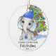 Crie um enfeite de fotos comemorando o Primeiro Natal de um bebê com um elefante bebê giro vestindo um boné azul e decorando uma árvore de Natal. Personalizado com o nome e o ano do bebê na frente com o título FIRST CHRISTMAS do script de pincel manuscrito e uma foto de sangria do cheio no verso. DICA DA FOTO: Escolha uma foto com o assunto no meio e/ou pré-recorte-a em forma quadrada ANTES de carregar. Entre em contato com o designer por meio do Zazzle Chat ou makeitaboutyoustore@gmail.com se você quiser que este design seja modificado ou outro produto.