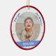 Tendy, elegante e fofo personalizou First Christmas Baby Boy Ornament para uma tia favorita com um quadro branco com flocos de neve e estrelas que tem uma abertura redonda para uma foto horizontal personalizada na frente e no verso, e uma banda rosa curva em cada lado na qual aparece o nome do bebê em uma fonte/tipografia elegante, e, no verso, o texto personalizado "Primeiro Natal 202X" certifique-se de personalizar o ano!). Esta design inclui na frente as palavras "Eu te amo, tia Johanna!", que você pode personalizar ou apagar. Com um quadro vermelho externo do Xmas.