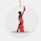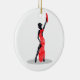O dançarino do Flamenco diminuiu o design em vermelho e preto. Ela está segurando um fã e parada em uma plataforma.