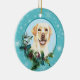 Na frente deste ornamento de Feriado está um belo retrato de um cão Labrador Retriever amarelo a espreitar de uma tosse sagrada e verde. Morangos vermelhos e cones de pínus decoram os sprigs de pinho e sprigs de pinho. A imagem é colocada sobre um círculo azul pálido formado por um padrão de floco de neve azul retrô. A parte de trás do ornamento tem o mesmo fundo e círculo com o seu texto personalizado em azul.