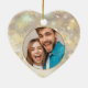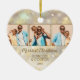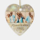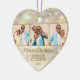 Suas 3 fotos favoritas são apresentadas na frente e uma na parte de trás de um ornamento cerâmico em forma de coração com flocos de neve dourados, estrelas e pontos em um fundo de férias de luzes e estrelas desfocadas. Carregue as suas próprias imagens para criar os enfeites das árvores de Natal para si próprio ou dê como presente à família, amigos, pais e avós! MAIS materiais, formas e DESIGNS em nossa loja.