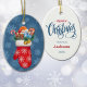 Este ornamento festivo de Férias faz um belo presente para vizinhos, amigos e família. A frente tem uma imagem de uma luva decorada com flocos de neve vermelhos e brancos cheia de doces de Natal, incluindo canetas doces, pacotes de presentes, uma fatia de laranja e sinos de ouro. A imagem é colocada sobre um fundo azul de floco de neve. O dorso é branco sólido, com texto estilizado em vermelho e azul que diz "MERRY CHRISTMAS". Seu texto de assinatura está em três campos abaixo. Brilhante e colorido!