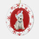 Na frente deste Enfeites de natal está uma bela imagem aquática de um adorável Terrier branco de West Highland vestindo um chapéu vermelho de Santa. A imagem é colocada em um círculo vermelho formado por um padrão retrovermelho de floco de neve em um fundo branco. A parte de trás do ornamento tem o mesmo fundo e círculo com o seu texto personalizado em branco. Bonita, especialmente para alguém que ama um Westie.