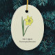 Um ornamento amarelo claro com uma ilustração botânica da flor daffodil em cores pastel (Narciso pseudonarciso) e um texto personalizável: perfeito para a decoração da árvore de Natal ou para um presente para um amante de flores. O daffodil selvagem é a flor da natalidade de março, a flor dos Peixes e Aries e é um significado simbólico de renascimento, perdão, criatividade, energia e vitalidade.