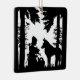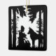 Esse ornamento cerâmico pendurado é preto e branco com uma imagem de silhueta de uma pequena capota vermelha ajoelhada sob árvores na floresta com água pode falar com o lobo. Personalize seu texto em preto com o modelo.