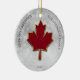 Folha de maple em vermelho profundo. Estilizado com uma falsa borda metálica dourada ao redor das bordas. Coloque uma neve de boque como fundo. Personalize com suas saudações, nome e ano em letras maiúsculas pretas. Do outro lado do ornamento você pode carregar sua própria foto.