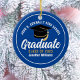 Este moderno Enfeites de natal de formando personalizado, azul e branco, apresenta uma tipografia branca típica do seu segundo grau ou nome da faculdade para a classe 2025. Personalize com o seu ano de graduação com o guião manuscrito preto chic e o boné de formando preto para um presente de graduação personalizado de excelente.