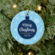 Este é um ornamento de férias de inverno simples, mas elegante, projetado em fundo azul cheio de flocos de neve e texto "Feliz Natal" junto com sua foto de família na parte de trás. Personalize este elegante ornamento cerâmico de fotos da família de flocos de neve de Natal com flocos azuis acrescentando a sua foto de família, assinatura da família e ano atual.