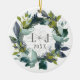 Este ornamento de feriado é perfeito para casais recém-engajados. O design apresenta uma coroa botânica aquática em tons de azul-claro, verde e lacre com suas iniciais monogramas e ano para personalizar um fundo branco e cinza de madeira intacta. O verso do ornamento tem sua foto personalizada com as palavras "Nosso Primeiro Natal Envolvido". Boa sorte no seu próximo casamento. Feliz feriado da nossa família para a sua!