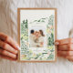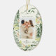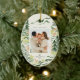 Ornamento cerâmico com sua foto de feriado da família apresentando ilustrações originais de árvores de Natal e verde.