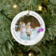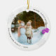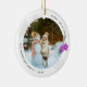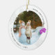 Enfeite moderno de Natal com foto redonda, flocos de neve, luvas rosa e fonte moderna.