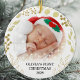 Este Enfeites de natal elegante é decorado com folhagem dourada sobre fundo branco. Facilmente personalizável com o nome do bebê, ano e foto. Note que as pequenas estrelas brancas não estão incluídas na design. Original Watercolor © Michele Davies.