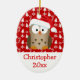 Adicione sua foto atrás. Adicione o nome das crianças e o ano, neste Enfeites de natal personalizado de crianças com uma coruja de desenho animado com chapéu vermelho, esta pequena cara bonita está pronta para se divertir com um pássaro animal. Uma coruja marrom de desenho animado vestindo um chapéu vermelho e branco, e um padrão de fundo feriado vermelho e branco para um monte de entusiasmos.